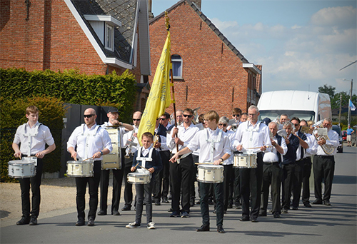 Onze fanfare zorgt voor feestelijke klanken tijdens de kermis in de Lindestraat van Overmere.